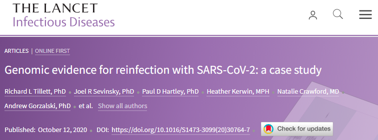 [1] Tillett RL, et al., (2020). Genomic evidence for reinfection with SARS-CoV-2: A case study. Lancet Infect Dis, DOI: 10.1016/S1473-3099(20)30764-7.