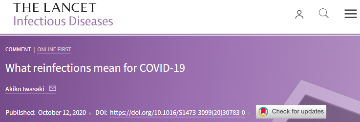 [2] Iwasaki A, et al., (2020). What reinfections mean for COVID-19. Lancet Infect Dis, DOI: 10.1016/S1473-3099(20)30783-0.